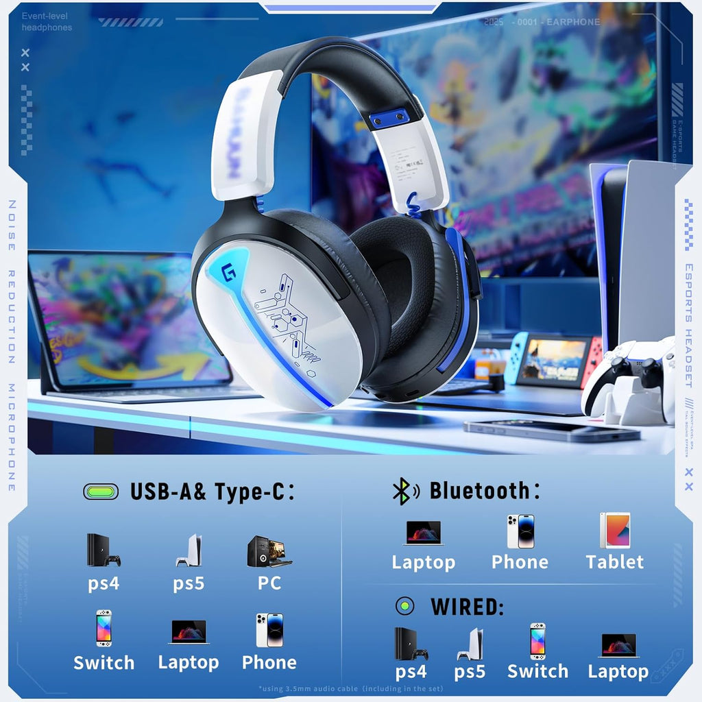Easily switch between 2.4GHz wireless (USB & Type-C), Bluetooth 5.3, and 3.5mm wired modes. Enjoy seamless compatibility with PS5, PS4, PC, Switch, laptops, and more.