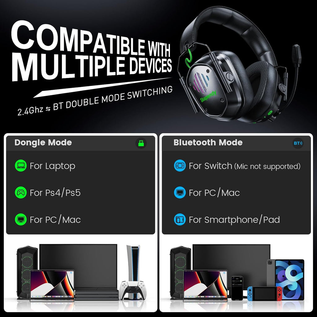 In 2.4GHz dongle mode, this gaming headset works seamlessly with PS5, PS4, PC, Switch, Mac, and laptops, offering performance that surpasses many competitors. Press the mic button for 2 seconds to switch to Bluetooth mode, compatible with PC, Mac, Switch, smartphones, laptops, and tablets.